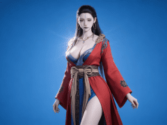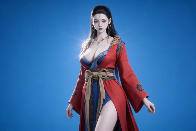 人物形象参考图2,写实风格,写真风格,建模3d皮肤,白嫩皮肤,美白滤镜,真人3d建模脸,超高分辨率,全身女,冷酷漠视,广角景深,高亮度,立体光,ue5建模,强对比,电影级特效,高挑修长,日系风格,纯色蓝色背景。3d动画渲染,壁纸。散射光,景深。