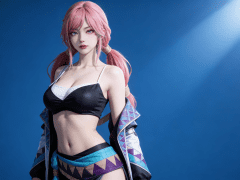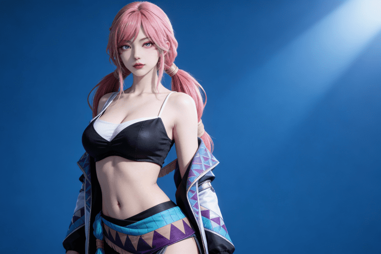 人物形象参考图2,写实风格,写真风格,建模3d皮肤,白嫩皮肤,美白滤镜,真人3d建模脸,超高分辨率,全身女,冷酷漠视,广角景深,高亮度,立体光,ue5建模,强对比,电影级特效,高挑修长,日系风格,纯色蓝色背景。3d动画渲染,壁纸。散射光,景深。