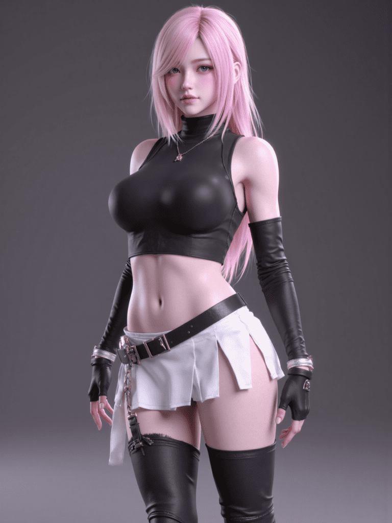 AF_Mecharashi_AynisNewman,pink hair,multicolored hair,turtleneck,streaked hair,black crop top,white miniskirt,black fingerless gloves,bracelet,belt,thigh strap,single thighhigh,torn thighhighs,high heel boots,knee boots,navel,hair between eyes,midriff,asymmetrical legwear,large breasts,