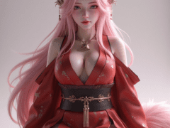 miyue,1girl,fox girl,green eyes,pink hair,long hair,very long hair,red kimono,off shoulder kimono,chest,large chest,bell necklace,black belt,bare legs,thighs,