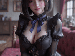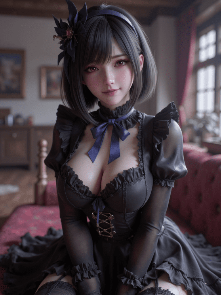 absurdres,1girl,solo,cowboy shot,kozueww,red eyes,black hair,short hair,black hairband,small breasts,gothic fashion,blue neck ribbon,black frilled dress,long dress,long sleeves,looking at viewer,smile,indoors,day,skindentation,detailed clothing folds,depth of field,sharp,high contrast,dynamic light,