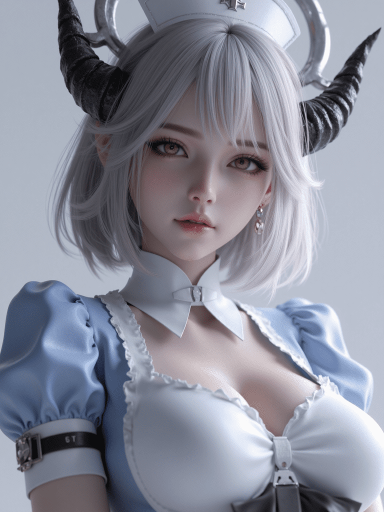 1girl,solo,eyelashes,(beautiful eyes),zzSena,yellow eyes,hair between eyes,black horns,grey hair,grey halo,short hair,nurse cap,large breasts,black horns,grey hair,armband,blue dress,short sleeves,nurse,white apron,hair between eyes,puffy sleeves,white headwear,black gloves,
