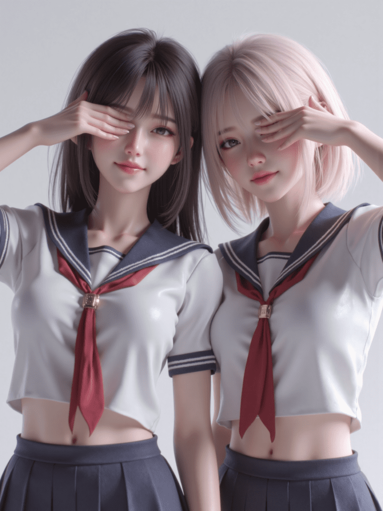 highres,very awa,very aesthetic,2girls,acheron \(honkai: star rail\),black swan \(honkai: star rail\),school uniform,breasts,dress shirt,pleated skirt,:d,short sleeves,summer,cowboy shot,smile,hands over anothers eyes,r3llsty333,