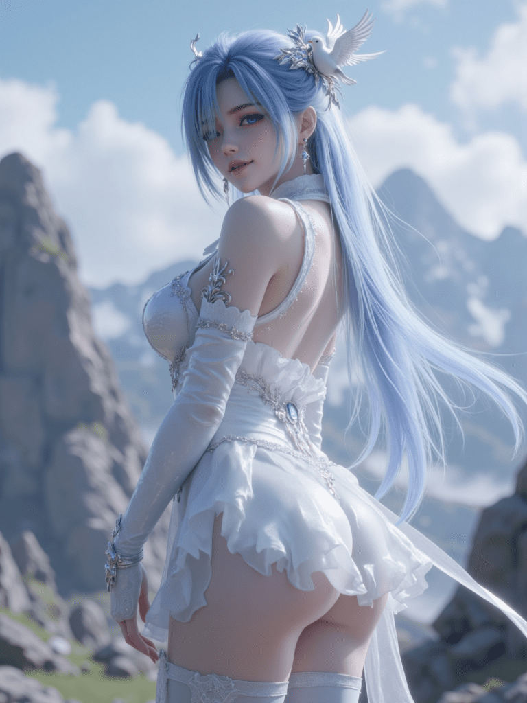 fuhua_cerulean court,fu hua,long hair,blue eyes,blue hair,bare shoulders,hair ornament,hair over one eye,white dress,jewelry,earrings,bird,thighhighs,