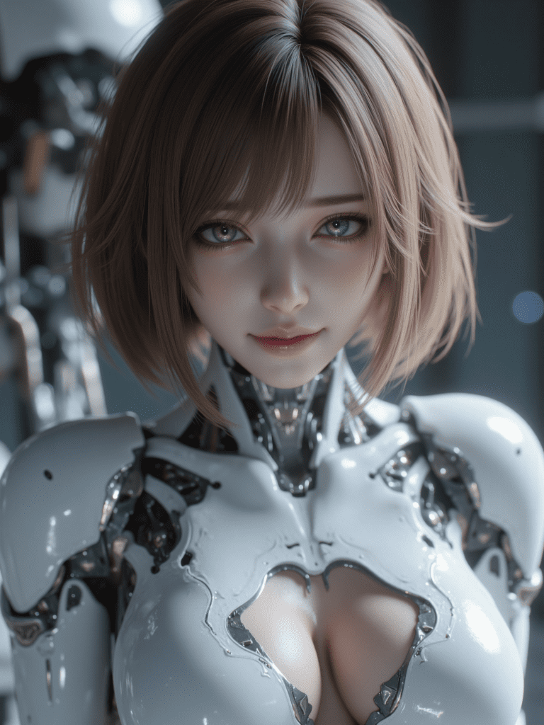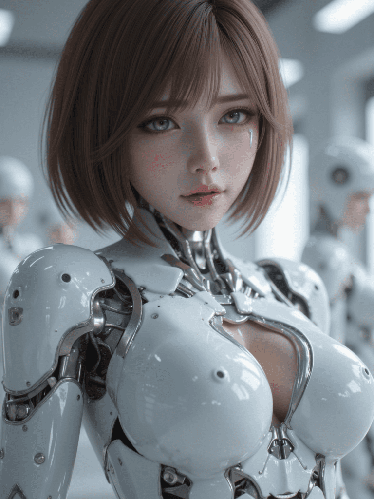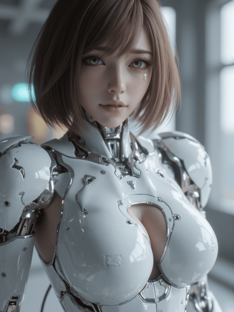 mechanical parts,solo,damaged,android,science fiction,cable,1girl,cyborg,,brown hair,short hair,purple eyes,(medium breasts:1.1),robot,green eyes,white skin,wires,cyberpunk,single tear,crying with eyes open,sad smile,silver trim,masterwork,masterpiece,best quality,detailed,depth of field,high detail,best quality,very aesthetic,8k,dynamic pose,depth of field,dynamic angle,adult,aged up,