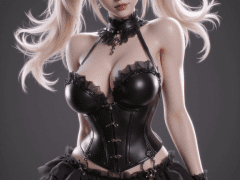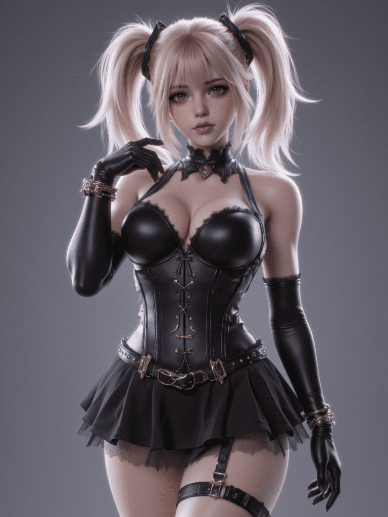 3d anime style image that features ANIV1 a blonde woman with twintails,and blue eyes wearing gothic fashion clothes including black short dress,corset,gloves,