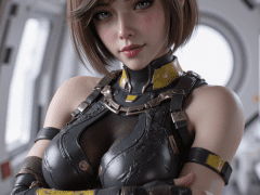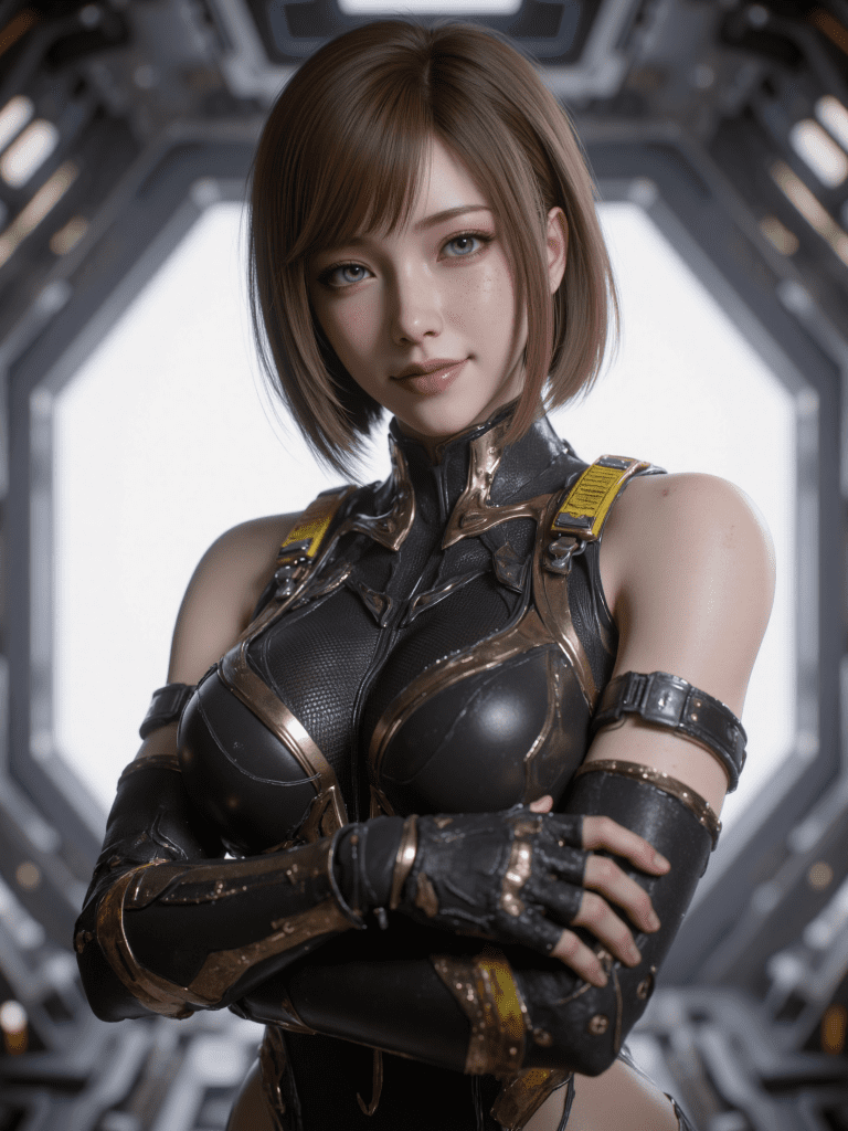 masterpiece,best quality,realistic rendering,high-quality textures,digital art,3D character,Lily,1girl,smile,short brown hair,layered bob haircut,side bangs,blue gray eyes,freckled face,pink lips,realistic skin texture,detailed face,standing pose,full body,black and gold armored bodysuit,exposed shoulders,mesh pattern fabric,utility straps,fingerless gloves,yellow accents,crossed_arms,inside the spacecraft,