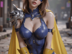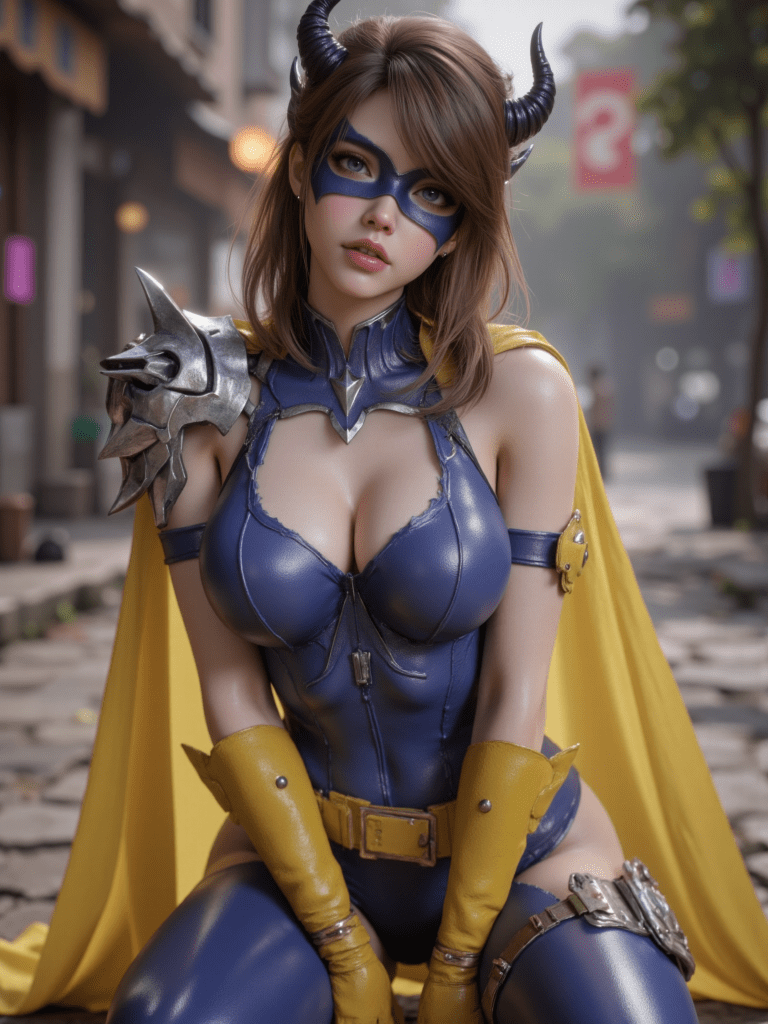 masterpiece,best quality,insaneres,absurdres,on one knee,full body,looking at viewer,outdoors,bokeh,negative space BREAK BodySuit_GothamKnights_Batgirl_ownwaifu,1girl,3d,blue eyes,brown hair,eyelashes,medium hair,nose,superhero,domino mask,lips,yellow cape,animal ears,yellow gloves,medium breasts,armor,utility belt,belt,cape,gloves,horns,yellow belt,blue bodysuit,breasts,swept bangs,photorealistic,mask,makeup,leather,power armor,skin tight,large breasts,lipstick,spandex,belt buckle,belt pouch,breastplate,capelet,shoulder armor,