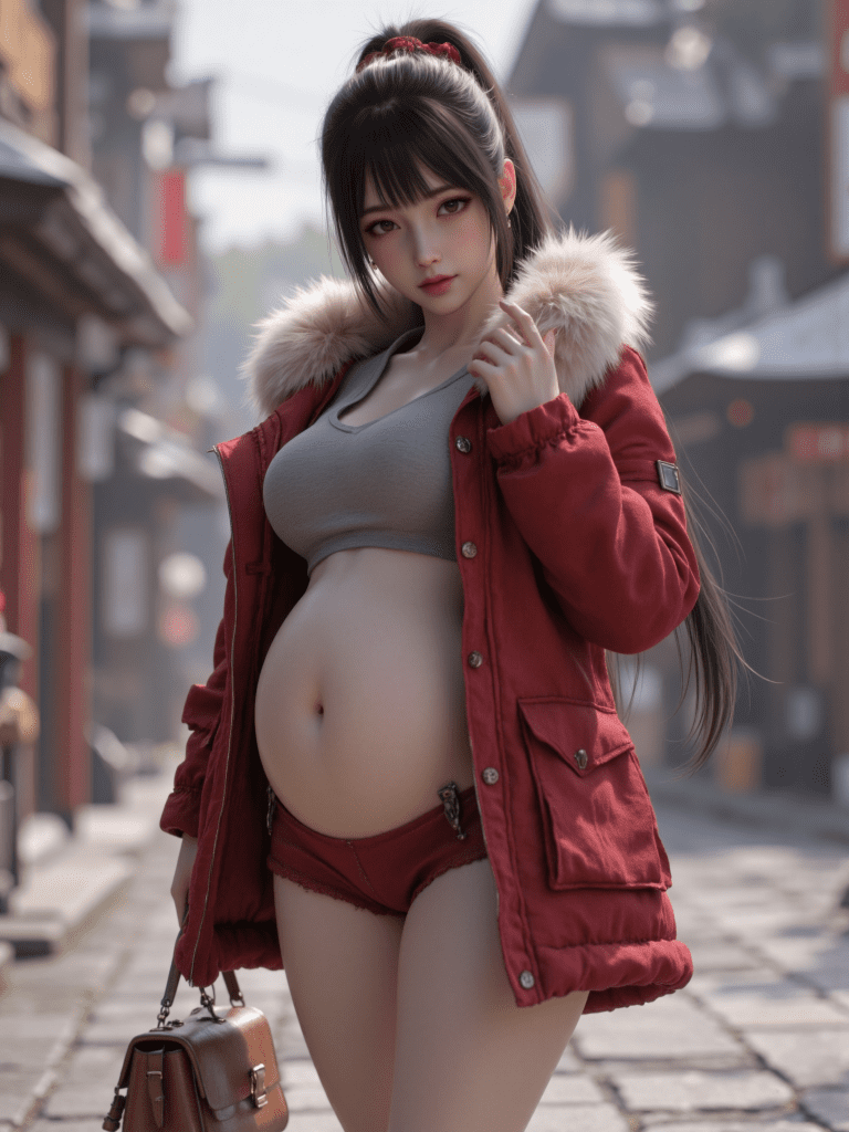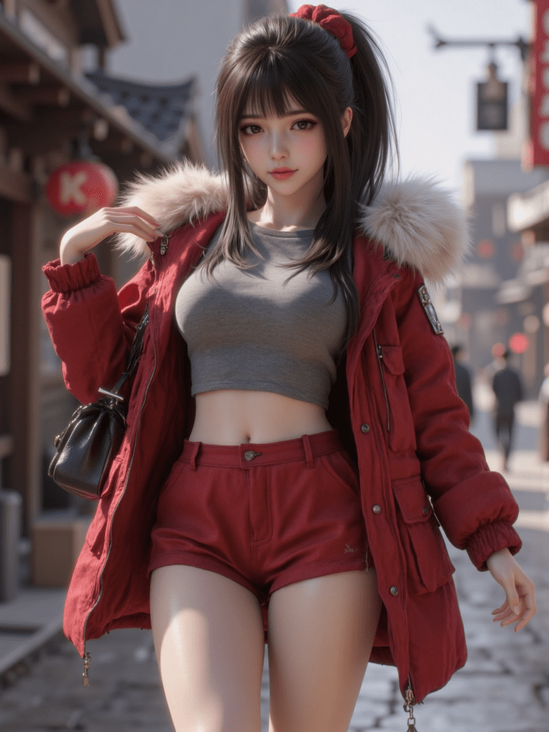 IL_Kurebayashi Yuzuki,1girl,black hair,brown eyes,solo,ponytail,bag,boots,coat,long hair,outdoors,jacket,red jacket,fur trim,scrunchie,red scrunchie,hair scrunchie,looking at viewer,grey shirt,boots,shorts,red shorts,