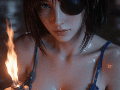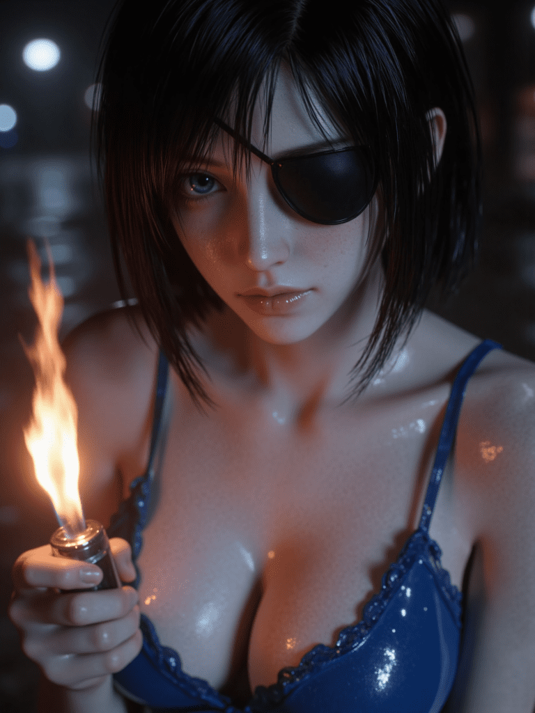 himeno chainsaw man,1girl,dark,black hair,blue camisole,blue eyes,breasts,camisole,cigarette,cleavage,eyepatch,fire,holding lighter,large breasts,((lighter, lighting cigarette)),looking down,night,short hair,solo,portrait,close-up,vignette,masterpiece,best quality,ultra-detailed,highest quality,official art,latest,very awa,very aesthetic,detailed shading,(detailed background, complex background),amazing quality,intricate,hyper-detailed,excellent,absurdres,latest,