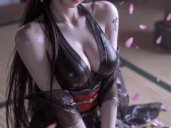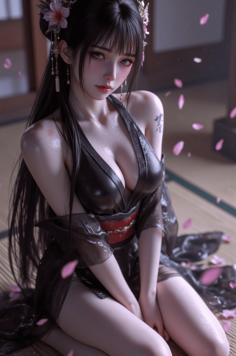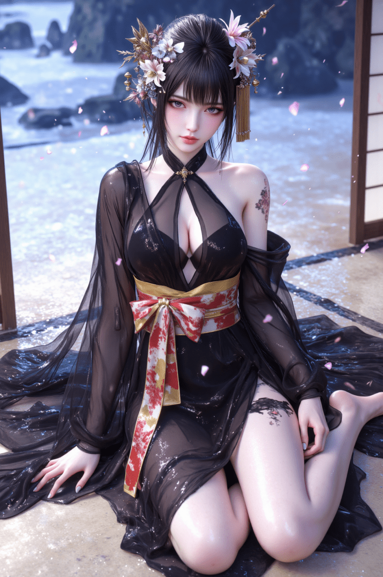 single off shoulder,shoulder tattoo,japanese clothes,black kimono,see-through kimono,sash,