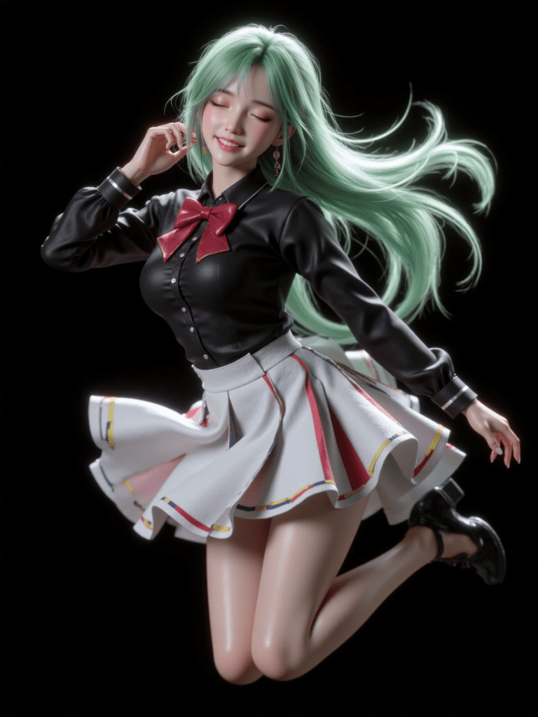 1girl,trin \(tone sphere\),long hair,closed eyes,green hair,black shirt,long sleeves,red bowtie,white skirt,multicolored skirt,vertical-striped skirt,black footwear,