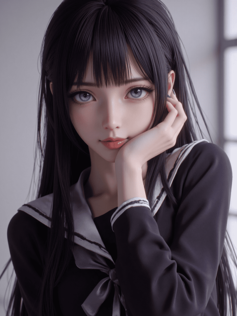 isayama_yomi,black hair,long hair,blunt bangs,hime cut,sidelocks,purple eyes,