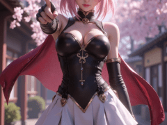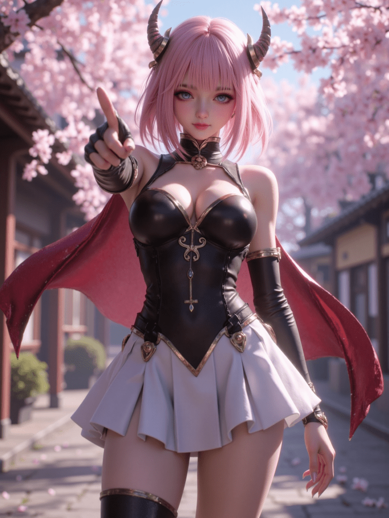1girl,solo,masterpiece,best quality,amazing quality,street,cherry blossoms,looking at viewer,<lora:aura_illust_scarxzys:1>,aura (sousou no frieren),blue eyes,pink hair,horns,blunt bangs,medium hair,braid,quad braid,white pupils,black dress,strapless dress,navel cutout,elbow gloves,red waist cape,white skirt,pleated skirt,thigh boots,pointing at viewer,
