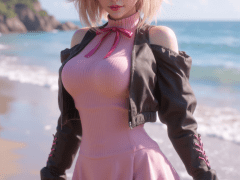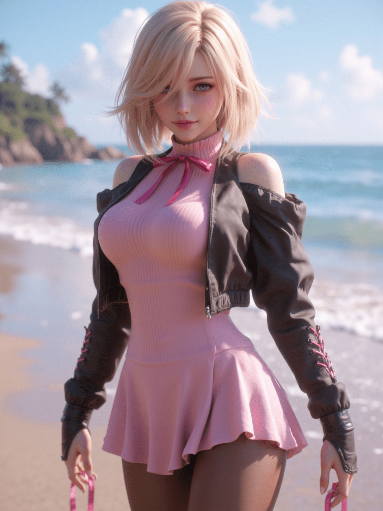 masterpiece,best quality,amazing quality,absurdres,aesthetic,newest,1girl,violet_evergarden_\(series\),solo,blonde hair,medium_breasts,standing,bokeh,looking at viewer,seductive smile,summer,shore,day,cowboy shot,dynamic angle,ofnishizasancostume,black off-shoulder jacket,puffy long sleeves,cross-laced sleeves,sleeves past wrists,pink breast ribbon,pink sleeveless sweater dress,turtleneck,brown pantyhose,black lace-up boots,pink shoelaces,