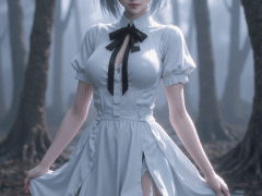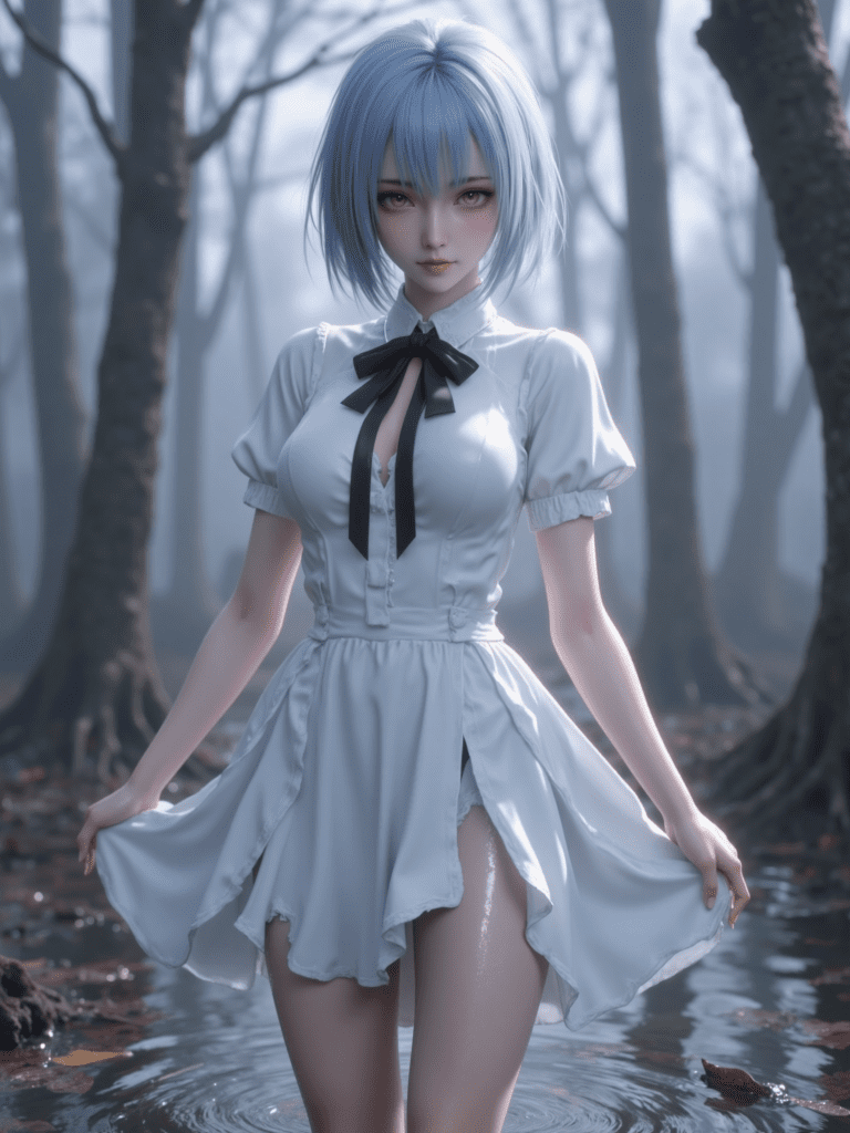 style_45,a female character with short blue hair wearing a white dress with a bowtie. she stands in a misty forest setting with bare trees in the background. the ground is wet and there are some fallen leaves and twigs around her. the overall mood of the image is mysterious and somewhat eerie.,1girl,solo,dress,red eyes,wading,short hair,white dress,looking at viewer,skirt hold,blue hair,short sleeves,hair between eyes,bare tree,breasts,ribbon,water,neck ribbon,standing,torn clothes,outdoors,medium breasts,closed mouth,realistic,tree,collared dress,black ribbon,blurry,lips,wet dress,ripples,blurry background,ayanami rei,