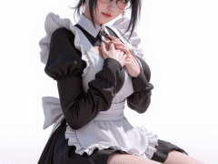mailen_cnr,1girl,black hair,single hair bun,bangs,orange eyes,round eyewear,large breasts,black dress,long dress,maid apron,maid headdress,long sleeves,juliet sleeves,maid,Goshiki Suzu,simple background,white background,sideways,solo,sad smile,grimace,one knee raised to chest,legs dangling,balanced posture,