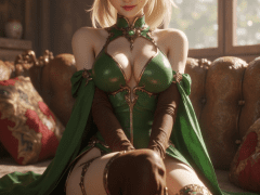 masterpiece,good quality,best quality,absurdres,highres,official art,game cg,anime screenshot,anime coloring,cinematic lighting,L1ya,1girl,elf,pointy ears,green eyes,blonde hair,ponytail,medium breasts,vertical-striped thighhighs,brown gloves,green elf outfit,knee boots,green capelet,chest jewel,forehead jewel,sitting,on bench,crossed legs,looking at viewer,smile,indoors,bedroom,sofa,sitting on sofa,