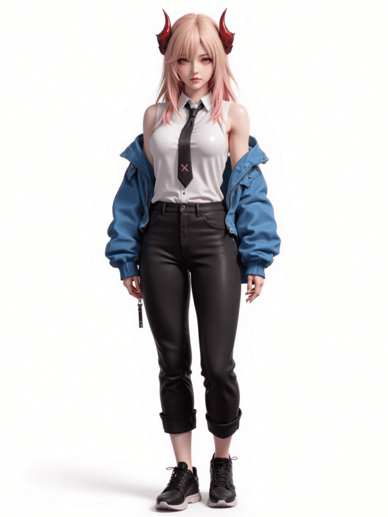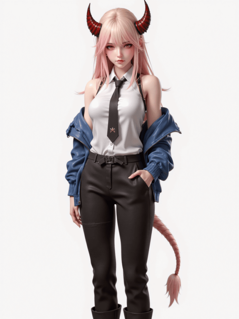 1girl,white background,full body,standing,1girl,horns,long hair,demon horns,bangs,pink hair,red horns,yellow eyes,cross-shaped pupils,orange eyes,symbol-shaped pupils,blonde hair,red eyes,hair between eyes,medium breasts,necktie,shirt,black necktie,pants rolled up,blue jacket,pants,breasts,collared shirt,jacket,white shirt,black pants,shoes,jacket partially removed,demon girl,off shoulder,black footwear,sneakers,open clothes,tall,