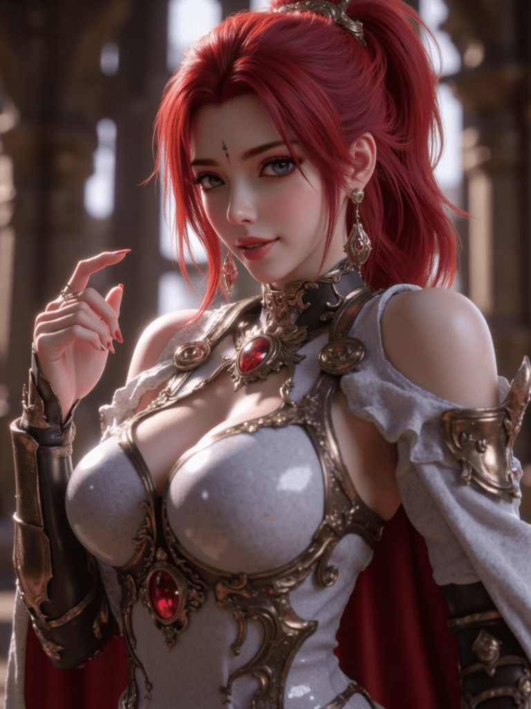 1girl,solo,Malty_Kamavati,red long hair,ponytail,green eyes,large breasts,slim waist,armored dress,cape,breastplate,detached sleeves,bare shoulders,vambraces,faulds,frilled choker,black choker,red gemstone looking at viewer,hand on hip,sticking out tongue,middle finger,cheeky grin,