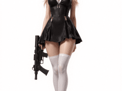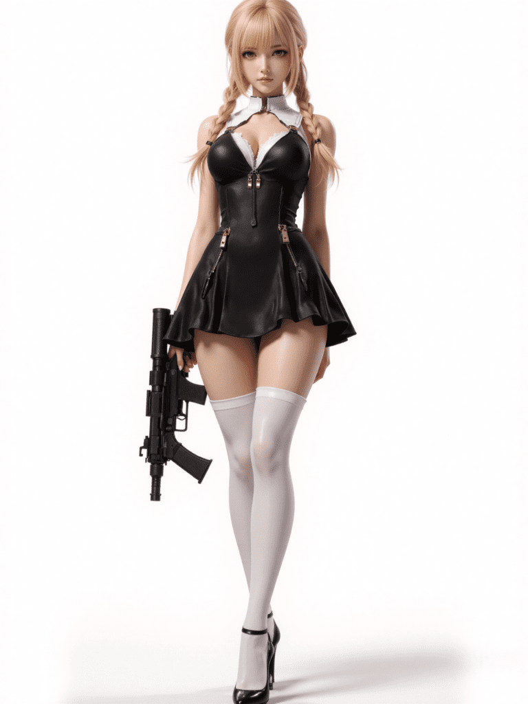 d_clothes,d_clothes,black dress,white underwear,white thighhighs,black high heels,<lora:Fixhands_anime_bdsqlsz_V1:1>,looking_at_viewer,white_background,simple_background,cowboy_shot,straight-on,standing,contrapposto,ass visible through thighs,(serious:0.9),submachine_gun,