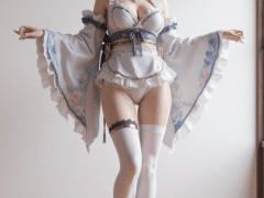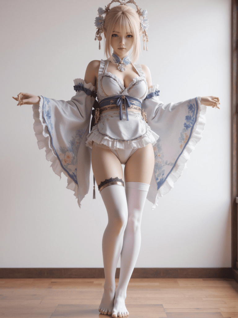 1girl,breasts,thighhighs,solo,japanese clothes,blonde hair,underwear,full body,white thighhighs,apron,kimono,blue eyes,bra,looking at viewer,hair ornament,standing,wide sleeves,indoors,frills,medium breasts,no shoes,cleavage,bangs,wooden floor,panties,halo,thighs,tall,