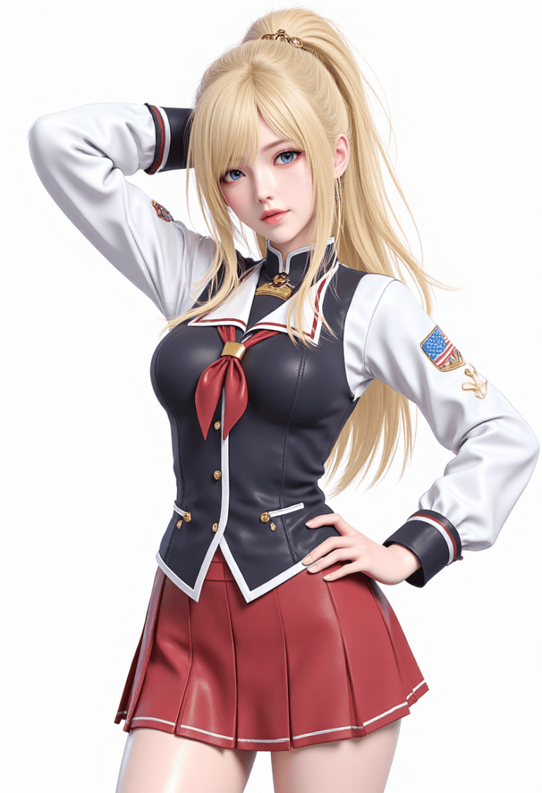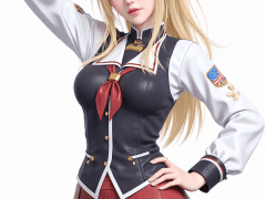 masterpiece,best quality,1girl,cute,Kaori Saeki,blue eyes,blonde hair,long hair,ponytail,wearing school uniform,red skirt,thighighs,long sleeves,white background,empty void,(cowboy shot:1.5),looking at view,one hand on hip,one hand behind head,from hip level,