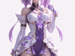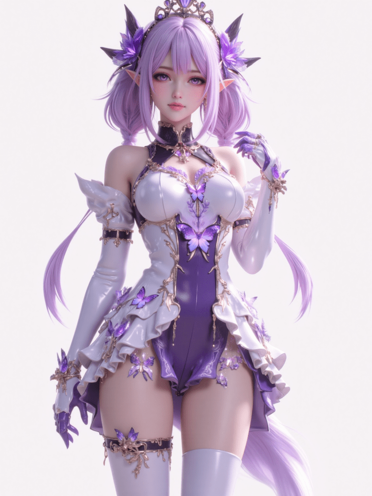 castorice_\(honkai_star_rail\),purple eyes,pointy ears,purple hair,low twintails,hair flower,purple hair bow,black tiara,colored inner hair,multicolored hair,black collar,purple gloves,asymmetrical gloves,elbow glove,bare shoulders,two-tone_dress,butterfly_print,thigh_boots,white pantyhose,high heels,