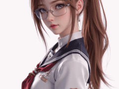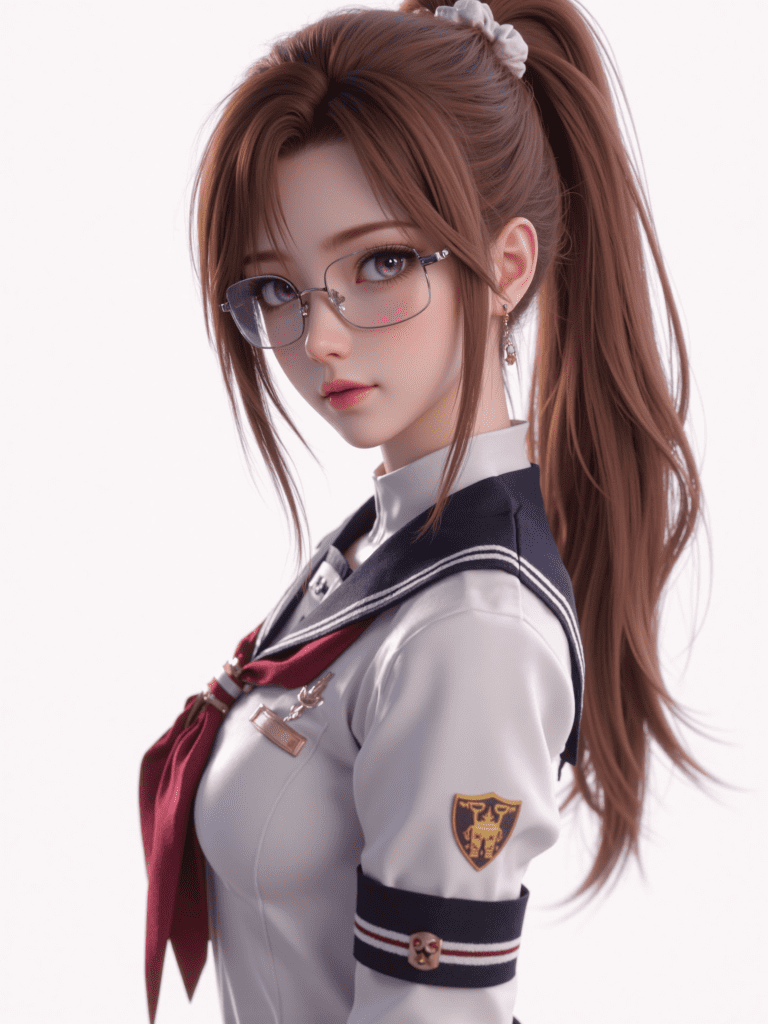 masterpiece,best quality,amazing quality,eva renfield,long hair,brown hair,purple eyes,ponytails,1girl,solo,glasses,hair ornament,ponytail,hairclip,semi-rimless eyewear,under-rim eyewear,uniform,scrunchie,full body,