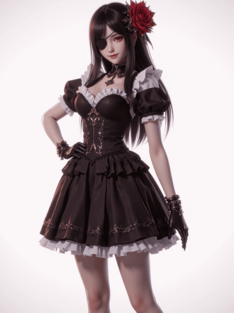 1girl,eyepatch,red eyes,dress,solo,long hair,flower,gloves,hair ornament,black gloves,hair flower,rose,looking at viewer,black hair,lolita fashion,gothic lolita,full body,black dress,red flower,smile,standing,hand on hip,breasts,red rose,short sleeves,medium breasts,black footwear,frills,