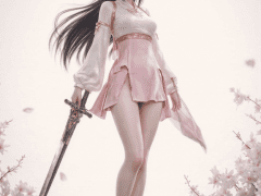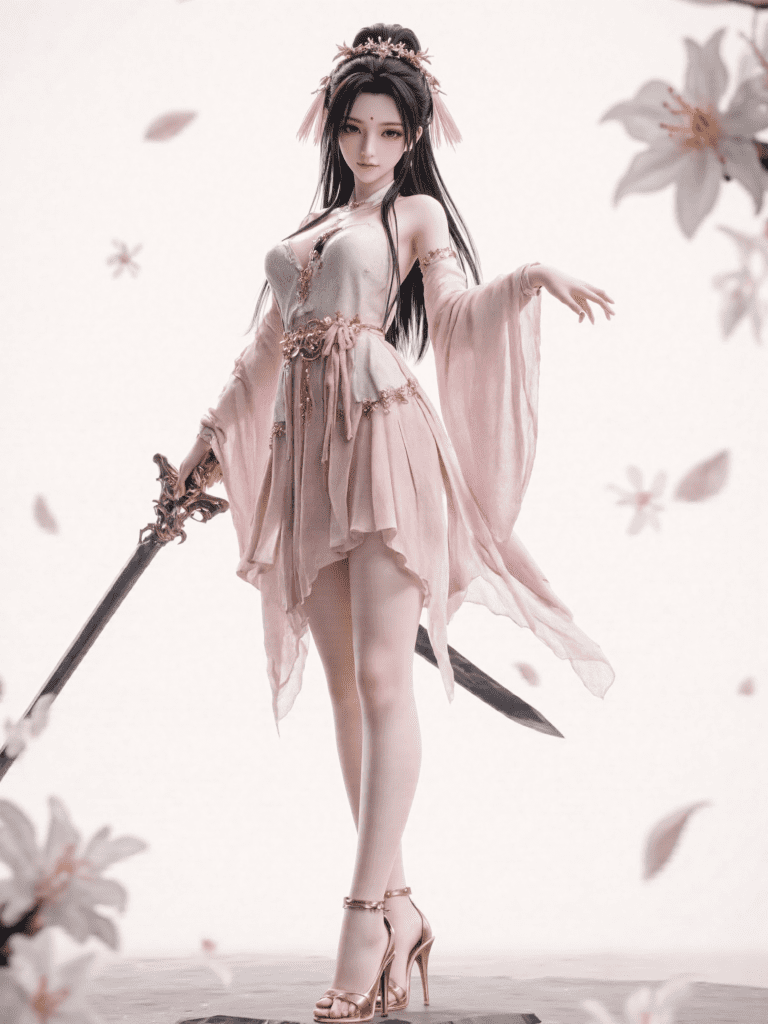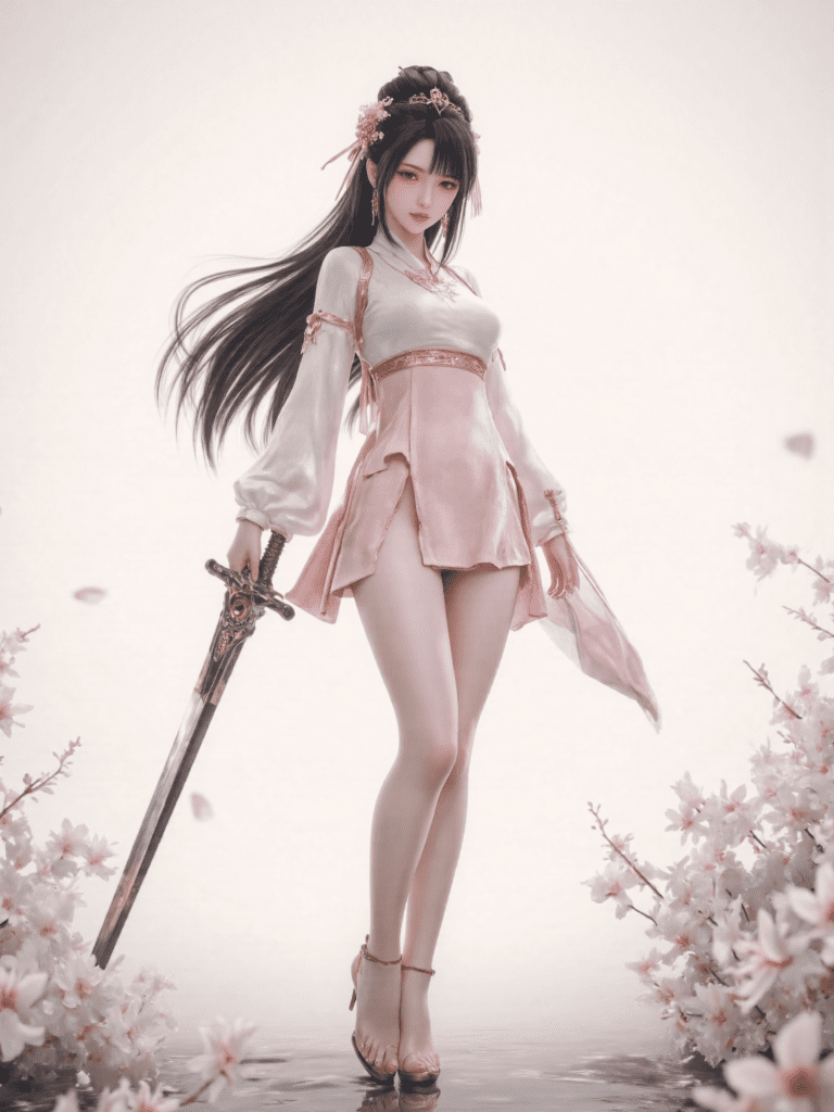mai_pgr_qu_lysh,mature female,(age_up:1.5) very_long_hair,black_hair,long_sleeves,headdress,hair_ornament,pink_dress,blunt_bangs,bare_legs,high_heels,holding_great_sword,mai_style,<lora:mai_dot_style_2:0.5>,skinny,