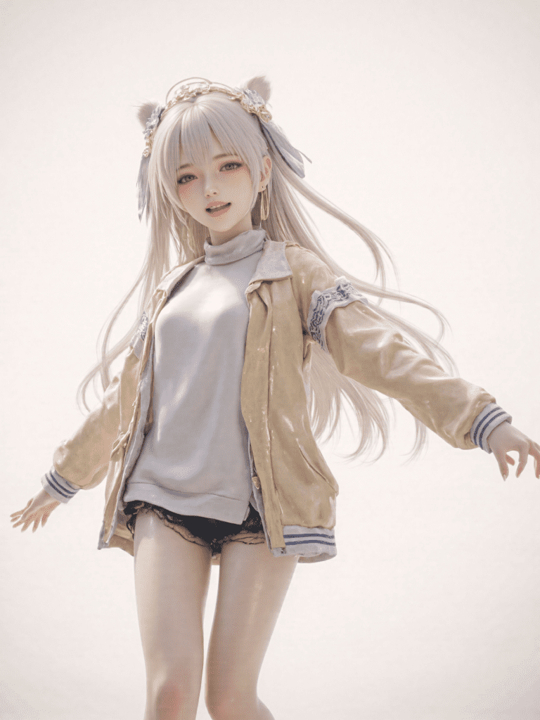 8K,pale skin,white skin,shinny skin,light vibe,Unreal Engine 5 ray tracing,hyper-detailed pore-level skin texture,cg style,cinematic lighting,Long exposure style,white background,simple background,looking at viewer,standing,