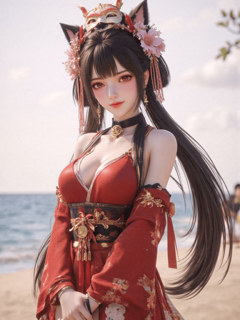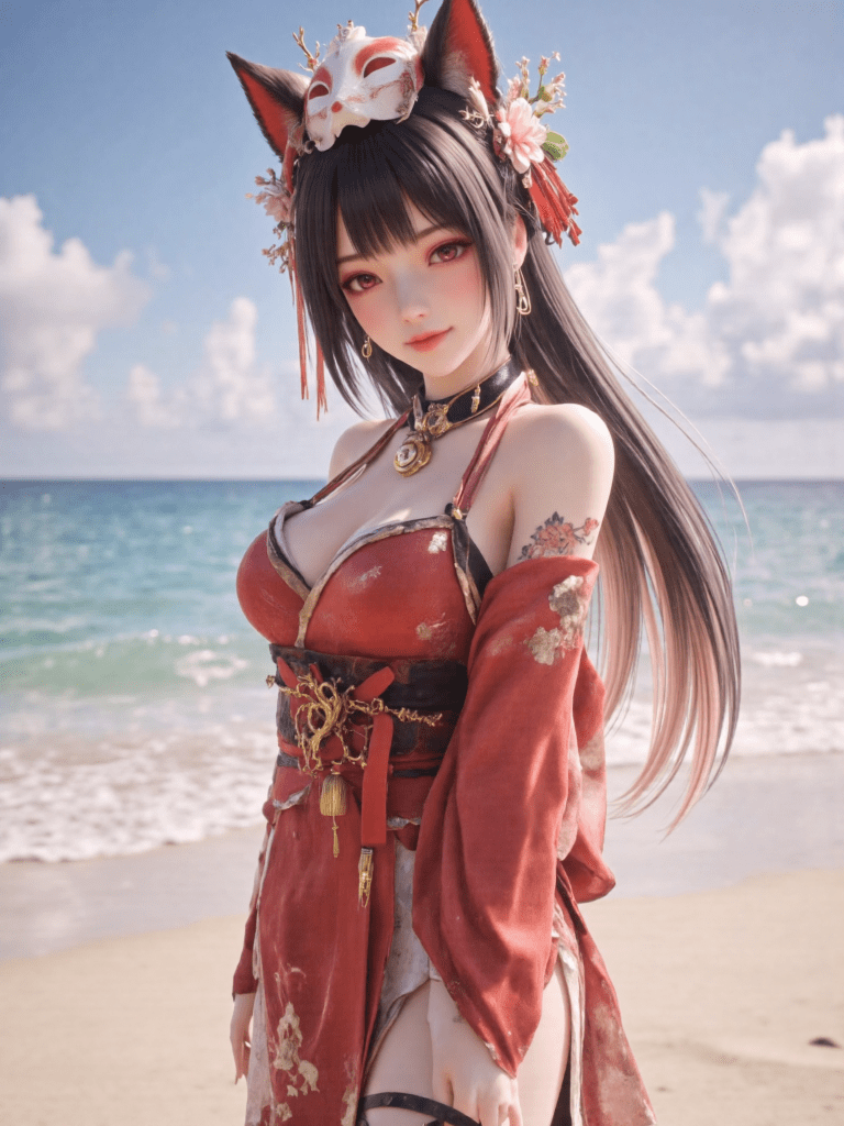 1girl,breasts,solo,outdoors,long hair,mask on head,mask,twintails,bell,sash,red eyes,obi,looking at viewer,arms behind back,jingle bell,fox mask,day,beach,smile,o-ring,bare shoulders,hair ornament,black hair,bangs,kimono,ribbon,closed mouth,hair ribbon,very long hair,thigh strap,japanese clothes,collarbone,tattoo,cowboy shot,ocean,tassel,red kimono,choker,black choker,detached sleeves,medium breasts,sky,standing,flower knot,cloud,red ribbon,red dress,cleavage,water,halterneck,blush,blunt bangs,flower,dress,sidelocks,multicolored hair,blue sky,thighs,gradient hair,sand,hair flower,makeup,