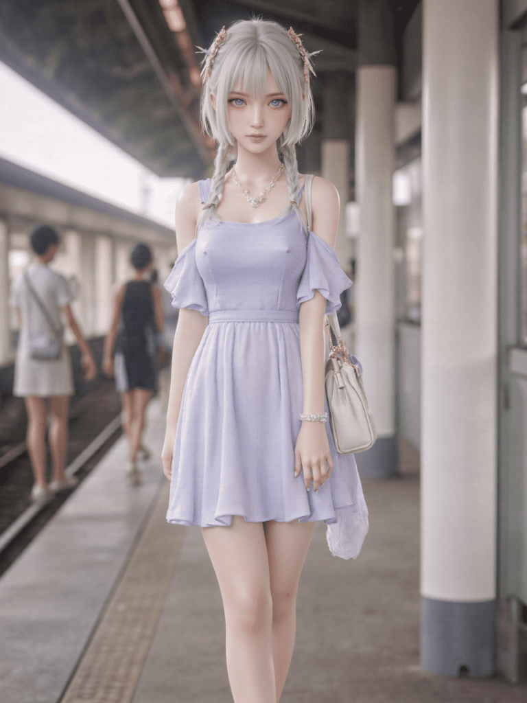 1girl,dress,pointy ears,solo,purple eyes,hair ornament,bag,blush,braid,full body,bangs,hairclip,standing,looking at viewer,sandals,closed mouth,sleeveless,sleeveless dress,breasts,blue dress,twin braids,elf,outdoors,bare shoulders,bare arms,white dress,shoulder bag,toes,handbag,day,train station,white footwear,holding,short hair,grey hair,