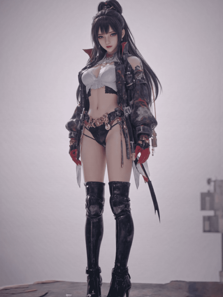 1girl,solo,long hair,bangs,black hair,gloves,standing,jacket,full body,multicolored hair,boots,pants,black footwear,high heels,red gloves,headwear removed,high heel boots,knee pads,masterpiece,best quality,amazing quality,