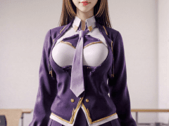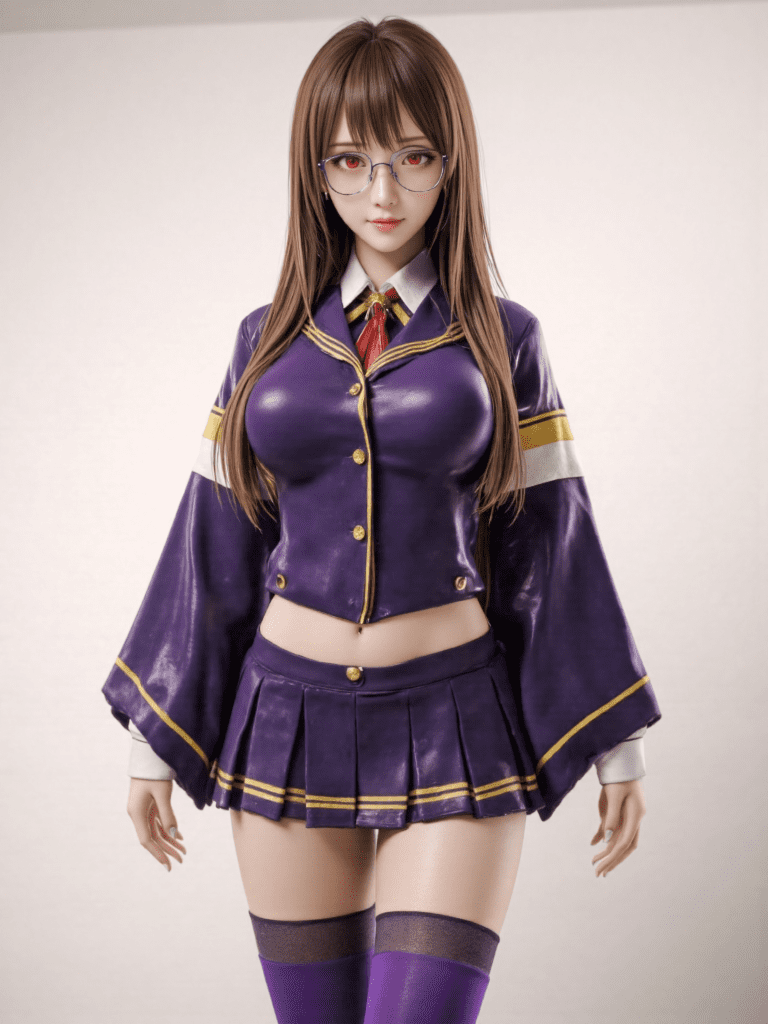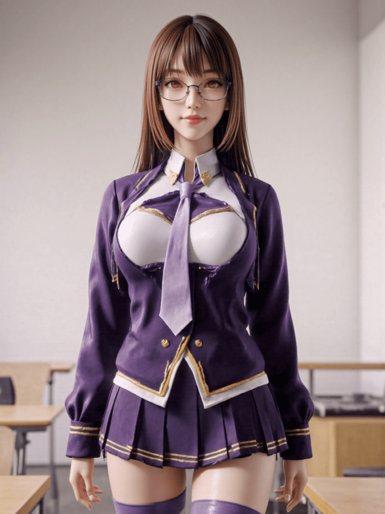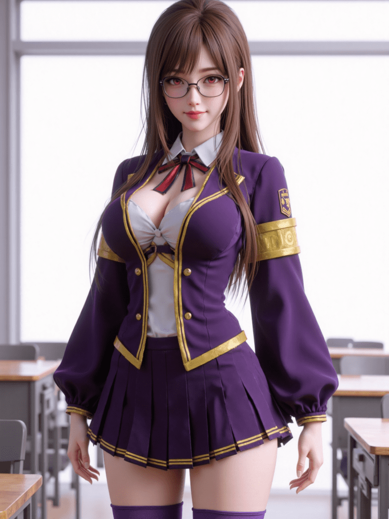4K,masterpiece,best quality,amazing quality,1girl,solo,brown hair,long hair,straight hair,red eyes,glasses,beautiful face,purple school uniform,two-tone jacket,pleated skirt,necktie,purple thighhighs,yellow trim,St Arcadia uniform,gigantic breasts,covered nipples,thick thighs,wide hips,standing,looking at viewer,straight-on,indoors,classroom,smile,Kaneda Maiko,