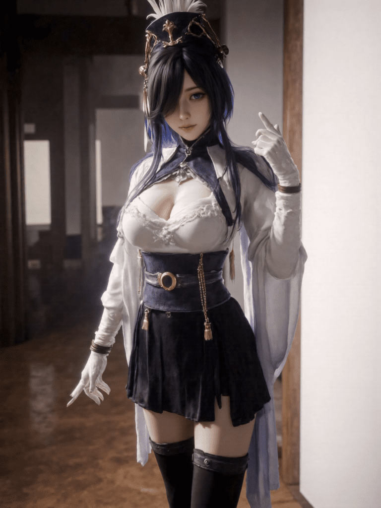 1girl,solo,gloves,white gloves,breasts,skirt,full body,standing,black hair,hat,hair over one eye,pantyhose,indoors,boots,looking at viewer,cape,large breasts,hand up,shirt,wooden floor,blue hair,white shirt,thighhighs,door,high-waist skirt,ascot,hallway,long sleeves,black skirt,bangs,long hair,thigh strap,ankle boots,