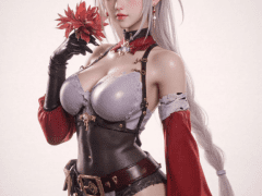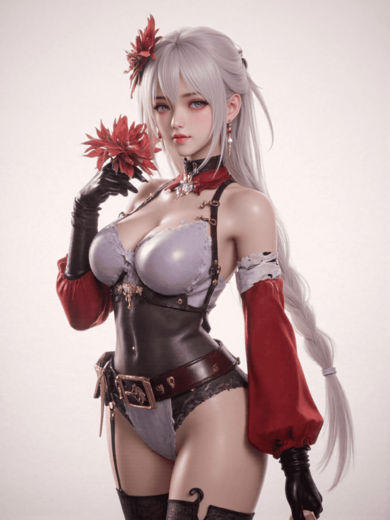 1girl,solo,breasts,long hair,flower,jewelry,earrings,detached sleeves,looking at viewer,bare shoulders,thigh strap,gloves,purple eyes,braid,holding,leotard,very long hair,pantyhose,eyepatch,strapless,covered navel,detached collar,parted lips,cowboy shot,bangs,red sleeves,black gloves,pouch,long sleeves,bandage over one eye,white hair,cleavage,red flower,holding flower,frills,large breasts,medium breasts,single glove,standing,strapless leotard,belt,bandages,black pantyhose,ass visible through thighs,gradient,