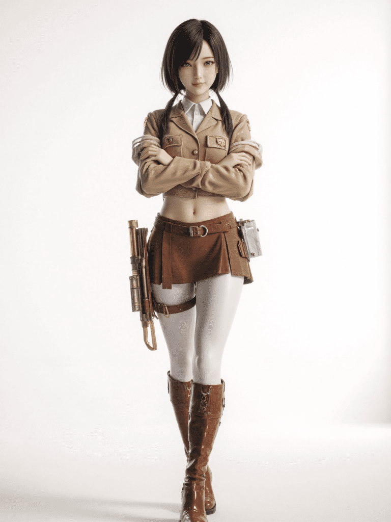 IL_Mina,anime coloring,solo,1girl,black hair,paradis military uniform,boots,three-dimensional maneuver gear,emblem,jacket,thigh strap,belt,grey eyes,weapon,knee boots,standing,low twintails,brown boots,footwear,brown footwear,short hair,cropped jacket,brown jacket,shirt,collared shirt,white shirt,pants,white pants,strap,strap buckle,skirt,wrap skirt,brown skirt,training corps \(emblem\),cowboy shot,smile,looking at viewer,crossed arms,