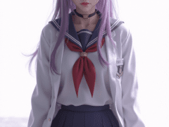 masterpiece,best quality,ultra-detailed,1girl,sitting pose,school uniform,sailor collar,red neckerchief,blue pleated skirt,long purple hair,straight hair,purple eyes,lab coat,choker,anime style,looking serious,clean white background,simple background,soft shading,detailed clothing folds,