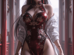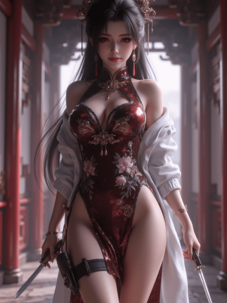masterpiece,best quality,ultra-detailed,1girl,long black hair,red eyeshadow,confident smile,seductive expression,chinese dress,embroidered qipao,high slit dress,peony embroidery,white jacket,long legs,thigh holster,throwing knives,oriental earrings,standing in hallway,dramatic lighting,mature woman,femme fatale,elegant and dangerous,anime style,