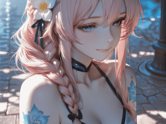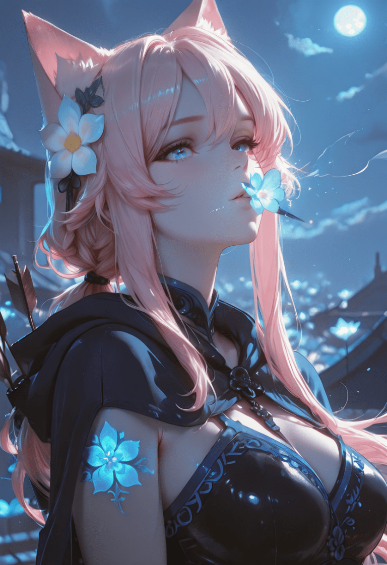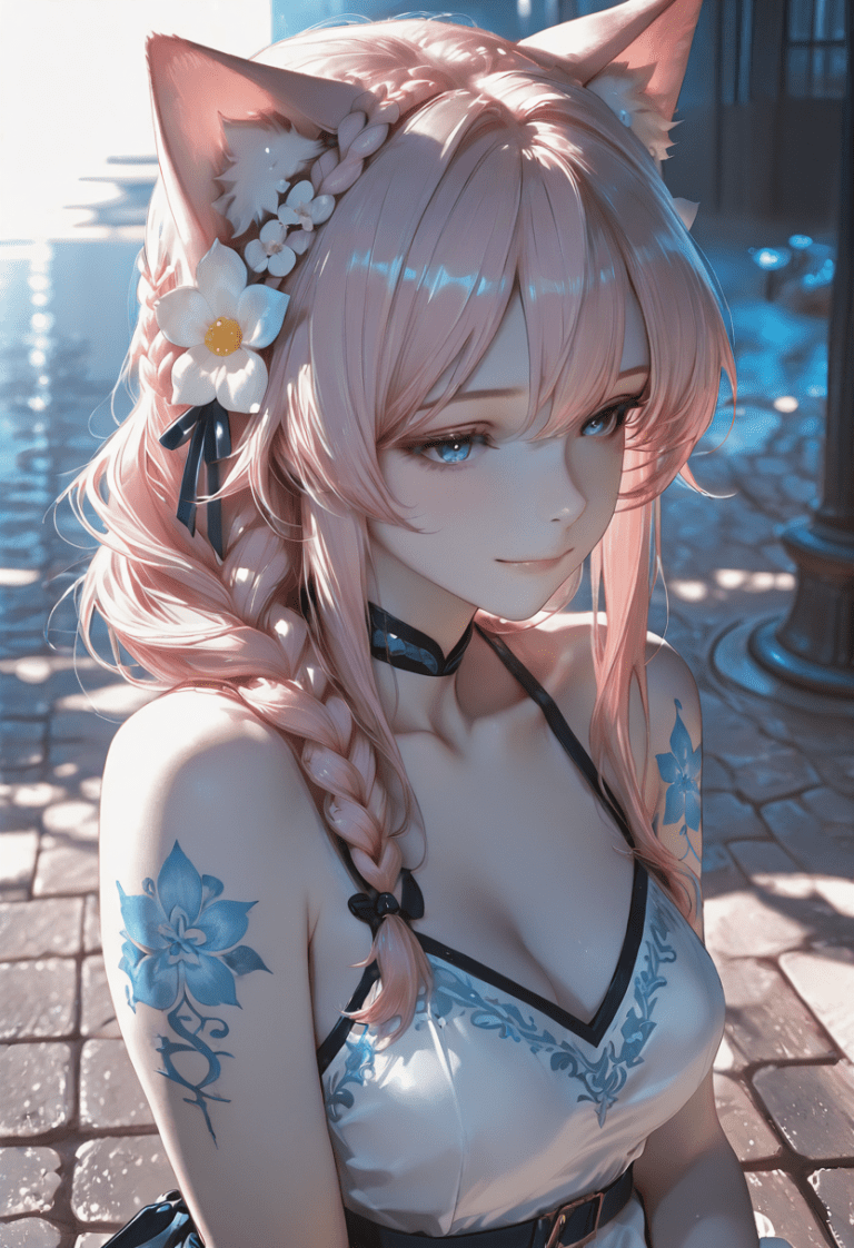 full-body, masterpiece, best quality, elegant anime illustration, seated gracefully on a low stone step, hands resting in lap, long pastel pink hair draped over shoulder, braided crown, white flower hair clip, serene blue eyes, soft smile, backless white dress with pale blue embroidery, navy ribbon belt, tattoo on upper arm visible, soft evening light, warm rim lighting, cobblestone path, depth of field, relaxed editorial fashion mood, cat ears,
