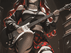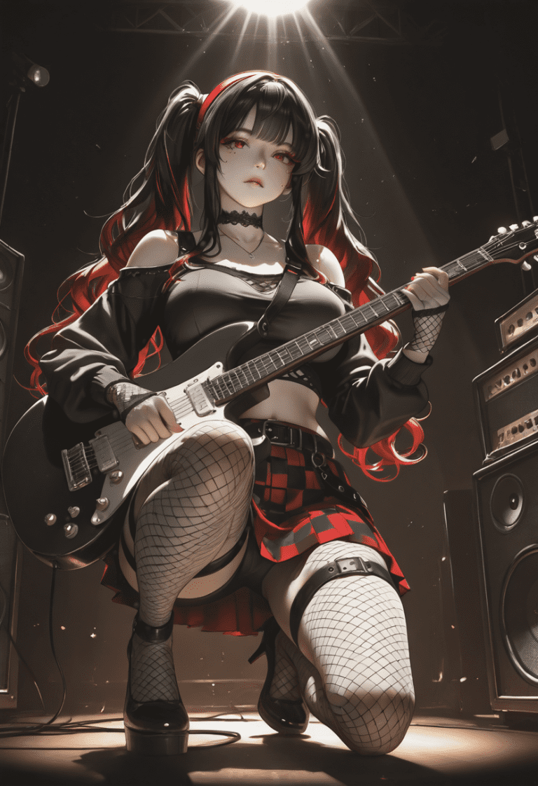 full body, on one knee, (play electric guitar:1.2), low angle,
