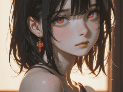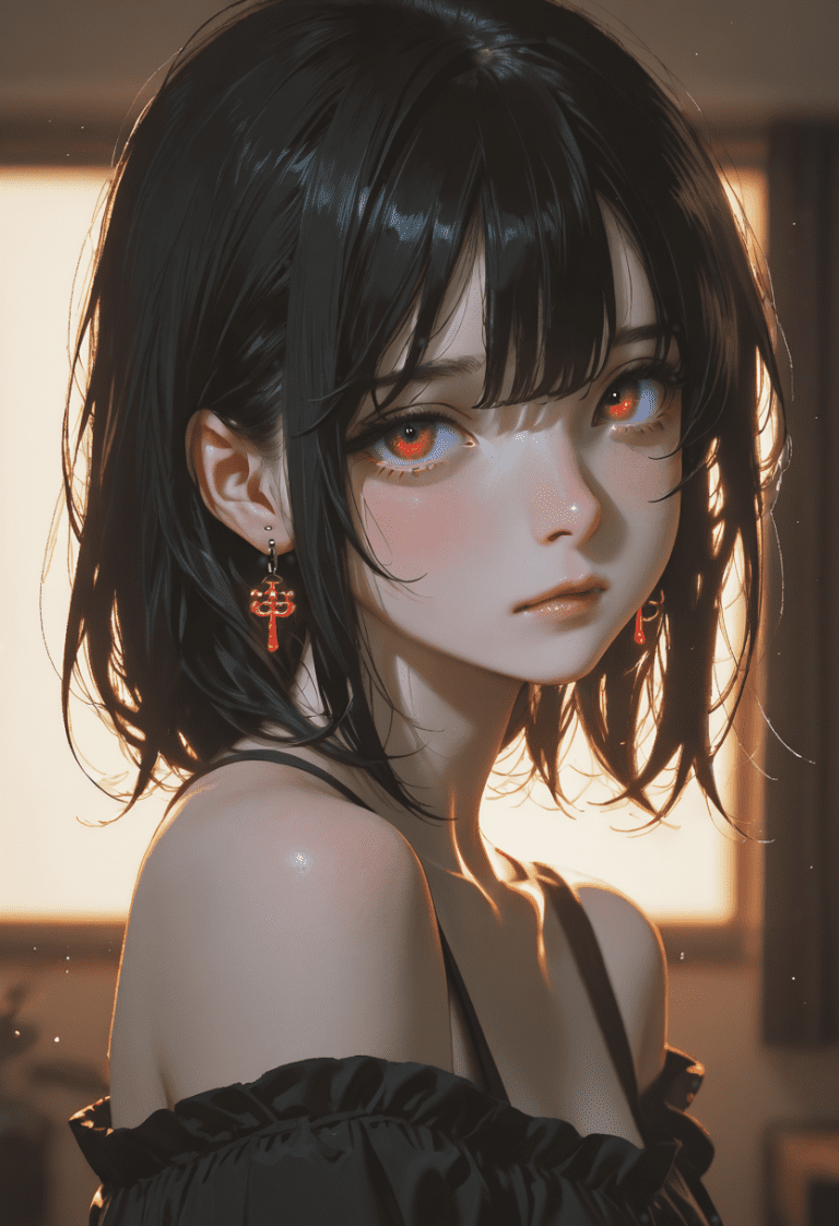 1girl, yor forger, black hair, red eyes, portrait, close up, black dress, off shoulder, bare shoulders, earrings, looking at viewer, dim lighting, blurred background