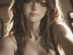 1girl, solo, brown hair, long hair, upper body shot, cleavage, seductive smile, japanese,