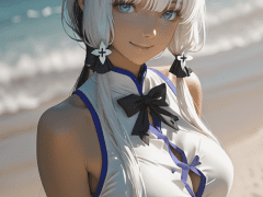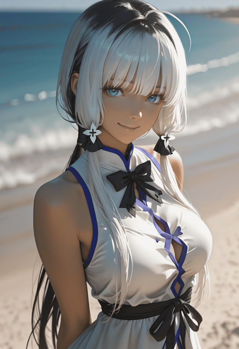 <lora:Niji_eop_illustrious:1.3>,detailed colored sketch,masterpiece,ultra-HD,high detail,depth of field,best quality,8k,best quality,ergonomic,(anime coloring, anime screencap),official art,1girl,solo,<lora:Karen_Oujou_-_Zombie_World_de_Harem_wo_Tsukurou_Manga_-_Illustrious:1>,oujou_zombie,white hair,straight hair,aqua eyes,bangs,medium hair,long sidelocks,dark skin,black hair_bow,medium breasts,white sleeveless_dress,smiling at viewer,hands behind back,at the beach,full_body,