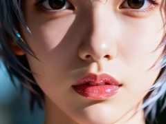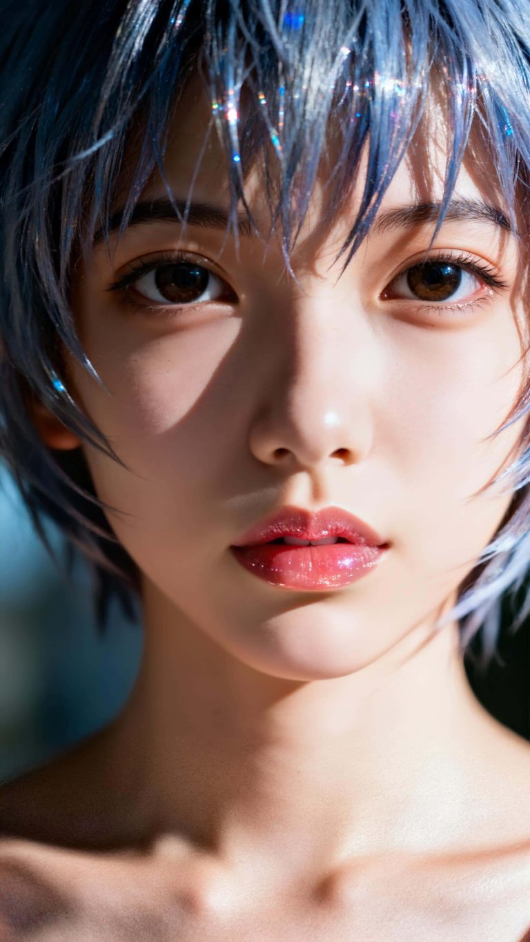 真实照片质感, EVA绫波丽,发丝凌乱透冷光,反光水润玻璃感晕染唇釉,魅惑又天真凝视镜头,电影级冷暖光对冲,明暗高对比,超精3D肌肤粒子(细腻肌肤/绒毛),柔焦虚化背景,胶片颗粒质感。画出上半身。
