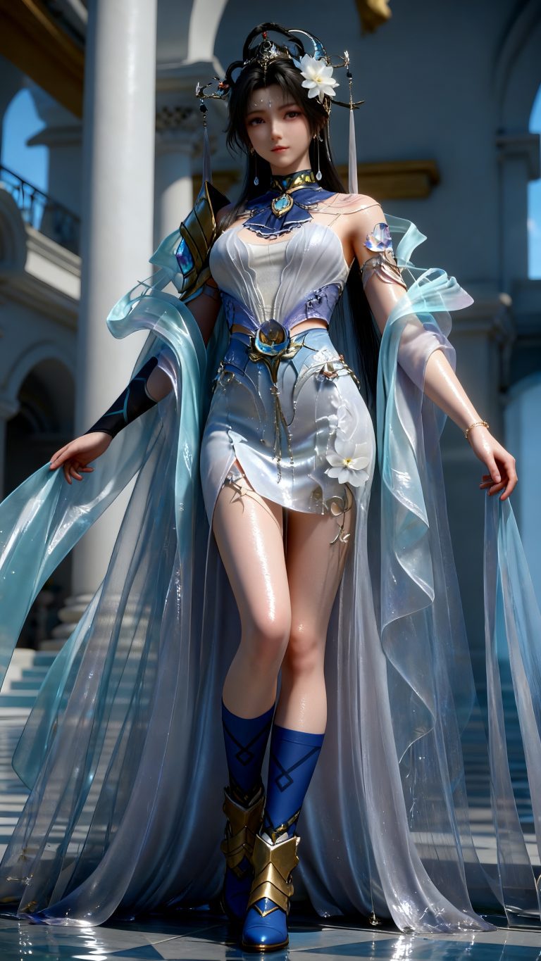 身穿参考图1中人物的服装和发型,使用参考图2中的体型和脸,少女,人物全身3D精美建模,国风3D建模脸,“加强脸部的立体效果”,精致的脸,3D高精度建模渲染皮肤,白皙柔嫩的皮肤,肌肤白嫩水光光泽,电影质感,体积光反射,光弥散,远景,绝世美女,写实真人,九头身模特身材,大长腿,大师杰作,细节清晰详尽,不要出现文字,随机pose,随机背景,魅惑的表情,oc渲染,辛烷值渲染,细节拉满,质感厚重,空气感,气质独特,动作诱人,随机元素堆叠组成,画面明亮。视觉盛宴,渲染直出。摄影后期处理。曼妙身材,大长腿,角色扮演,究极细节,大师级光影,真实服装效果,服装细节质感。3D国风动漫,细腻的皮肤,干净无暇的真实皮肤,CG渲染,氛围感,光感,自然姿势,HDR环境光,运用弥散光和轮廓光特写,采用光线追踪和电影光效呈现流体效果,伦勃朗光。成女体型。
