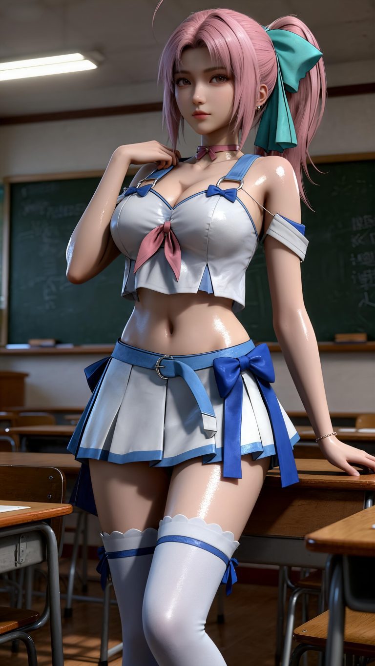 身穿参考图1中人物的服装和发型,使用参考图2中的体型和脸,少女,人物全身3D精美建模,国风3D建模脸,“加强脸部的立体效果”,精致的脸,3D高精度建模渲染皮肤,白皙柔嫩的皮肤,肌肤白嫩水光光泽,电影质感,体积光反射,光弥散,远景,绝世美女,写实真人,九头身模特身材,大长腿,大师杰作,细节清晰详尽,不要出现文字,随机pose,教室背景,魅惑的表情,oc渲染,辛烷值渲染,细节拉满,质感厚重,空气感,气质独特,动作诱人,随机元素堆叠组成,画面明亮。视觉盛宴,渲染直出。摄影后期处理。曼妙身材,大长腿,角色扮演,究极细节,大师级光影,真实服装效果,服装细节质感。3D国风动漫,细腻的皮肤,干净无暇的真实皮肤,CG渲染,氛围感,光感,自然姿势,HDR环境光,运用弥散光和轮廓光特写,采用光线追踪和电影光效呈现流体效果,伦勃朗光。成女体型。