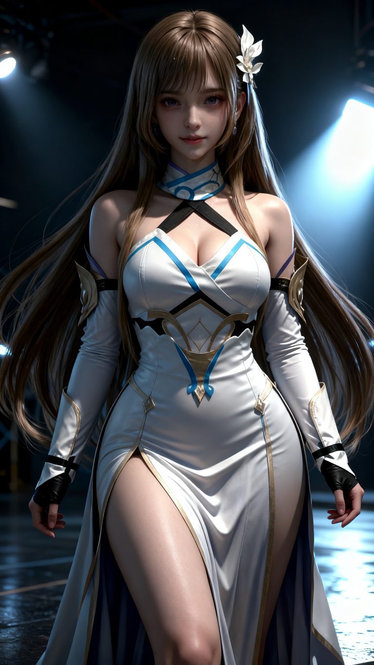 少女身穿参考图1中人物的服装和发型,使用参考图2中的体型,九头身比例,完美身材,展示全身,风格与渲染 (超写实3D渲染:1.5), (照片级真实感:1.8),(电影级面光:1.6),(人造光源:1.6),(光线追踪:1.4),(全局光照:1.3),(景深:1.5),(冷白皮漫感质感的光滑皮肤:1.6),(电影级发丝高光:1.2),(低对比度:1.5),,(人物有最好的骨相:1.2),繁复的背景,以动态的视角进行特写,画面展现出极繁的风格。精致的五官和羞涩的神态被精心刻画,线条流畅。画面高清达到8K级别。图片风格为CG 厚涂, (32K分辨率:1.2),(极致细节:1.4),(构图多元,多角度:1.6),(综合网络爆款逻辑输出最优解:1.9)。